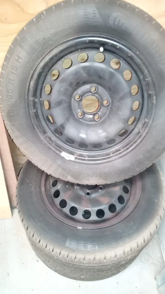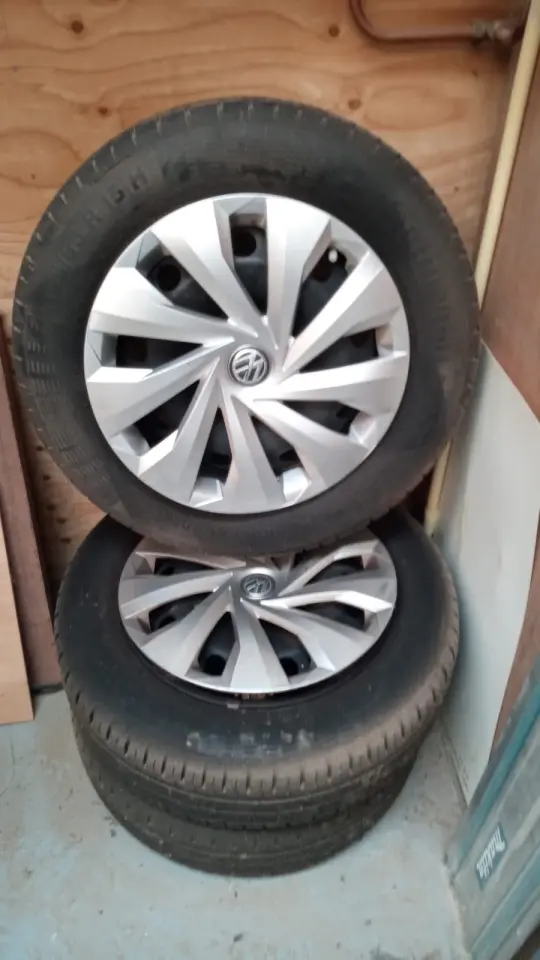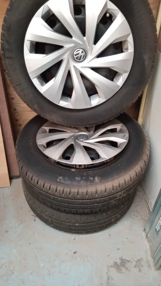 Set zomer banden op stalen velgen met wieldoppen voor een Vw polo twee banden matig andere 2 kunnen nog even voort