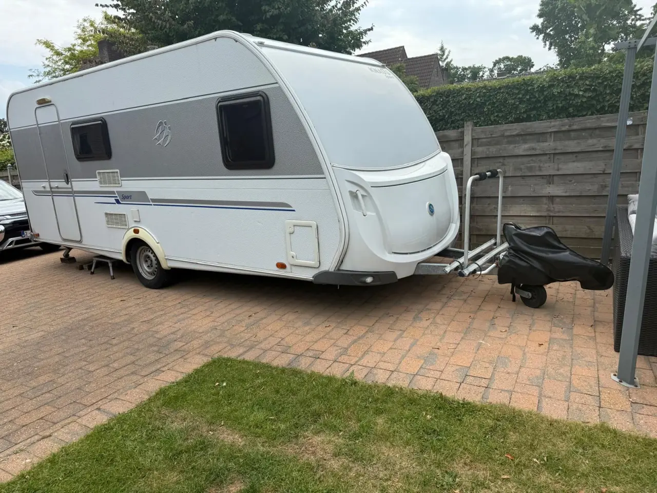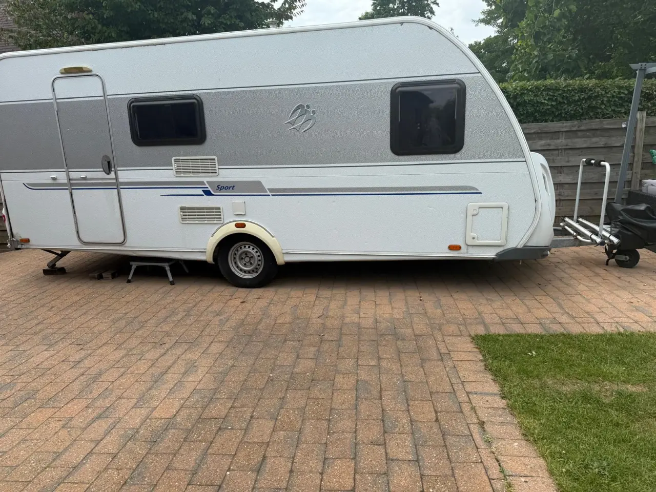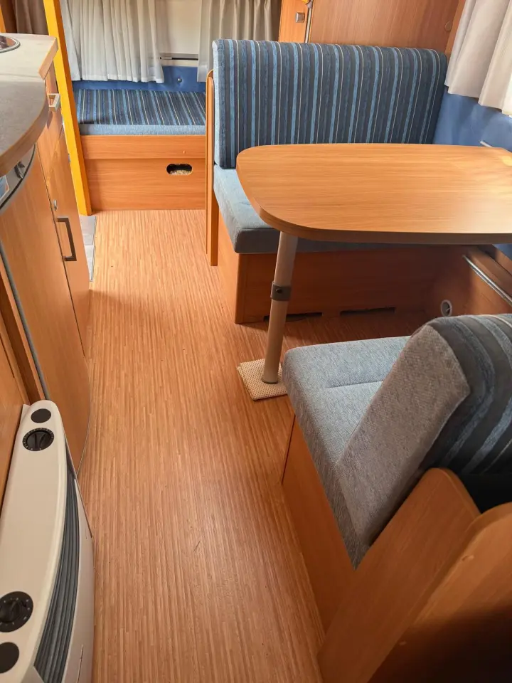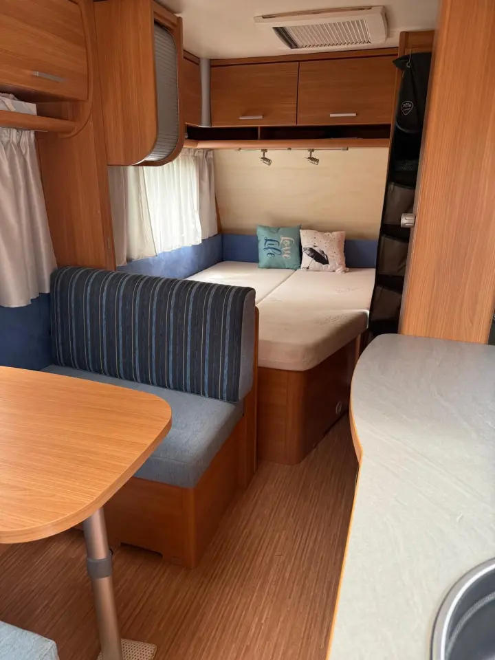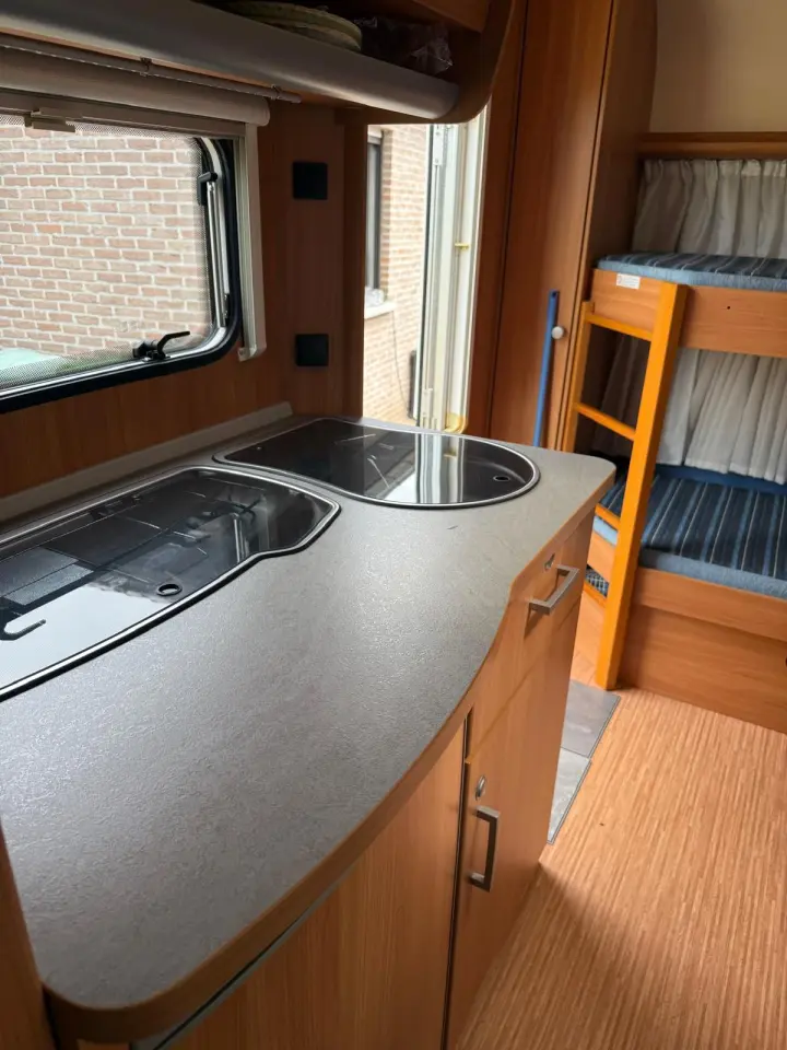 Totale lengte = 728 cm, Binnenlengte = 532 cm, lediggewicht = 1090 kg, Max. totaalgewicht = 1400 kg, 5 slaapplaatsen waarvan het vast bed en de stapelbedden met lattenbodem zijn. Knaus 500 FDK sport met sudwind accessoires met voortent en fietsendragers voor- en achter