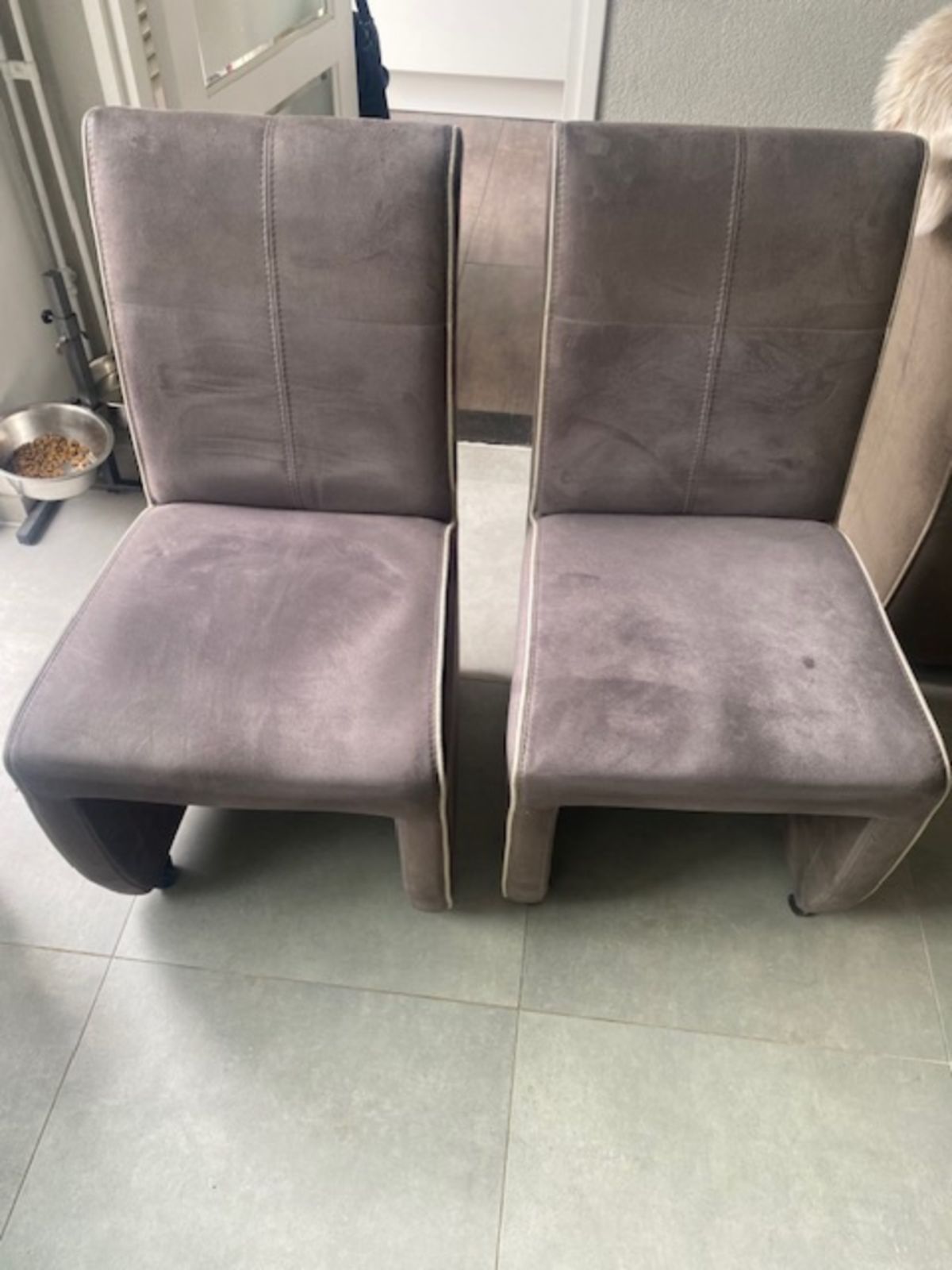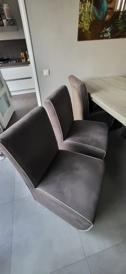 Mooie eethoek met 6 stoelen op wieltjes met hoge rugleuning Alcantara stof. Afmeting tafel 200x90 cm. Stoelen zitten nog prima. Ivm aanschaf nieuwe eethoek wordt deze verkocht. Bontjes op de foto’s worden niet verkocht.