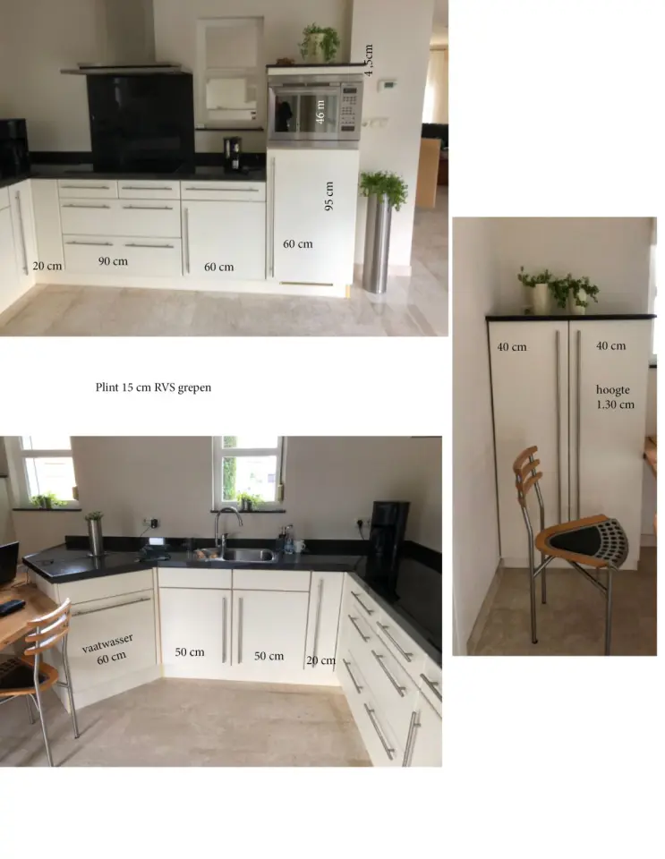 Aanbouwkeuken Beige (Vanille) met RVS handgrepen, maten zie tekening. Incl. Miele vaatwasser, Miele koelkast 172 liter, Gaggenau wasemkap 90 cm, magnetron Siemens Micro welle plus. Top Line, Siemens Inductie kookplaat 5 pits.90 cm Te aanvaarden dec 2025. 1750.00. Zien is kopen. Zie ook alle andere adv. van deze verkoper. (Tinnemans Keukens Ittervoort)