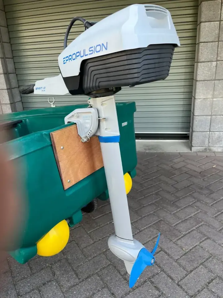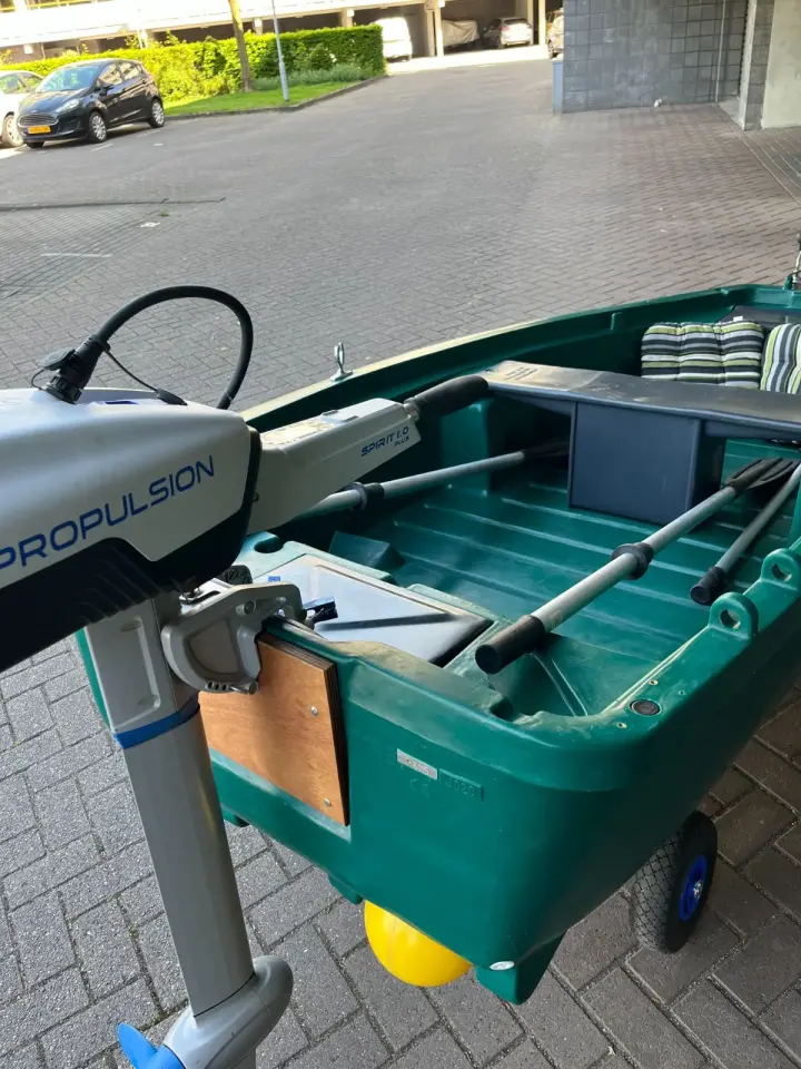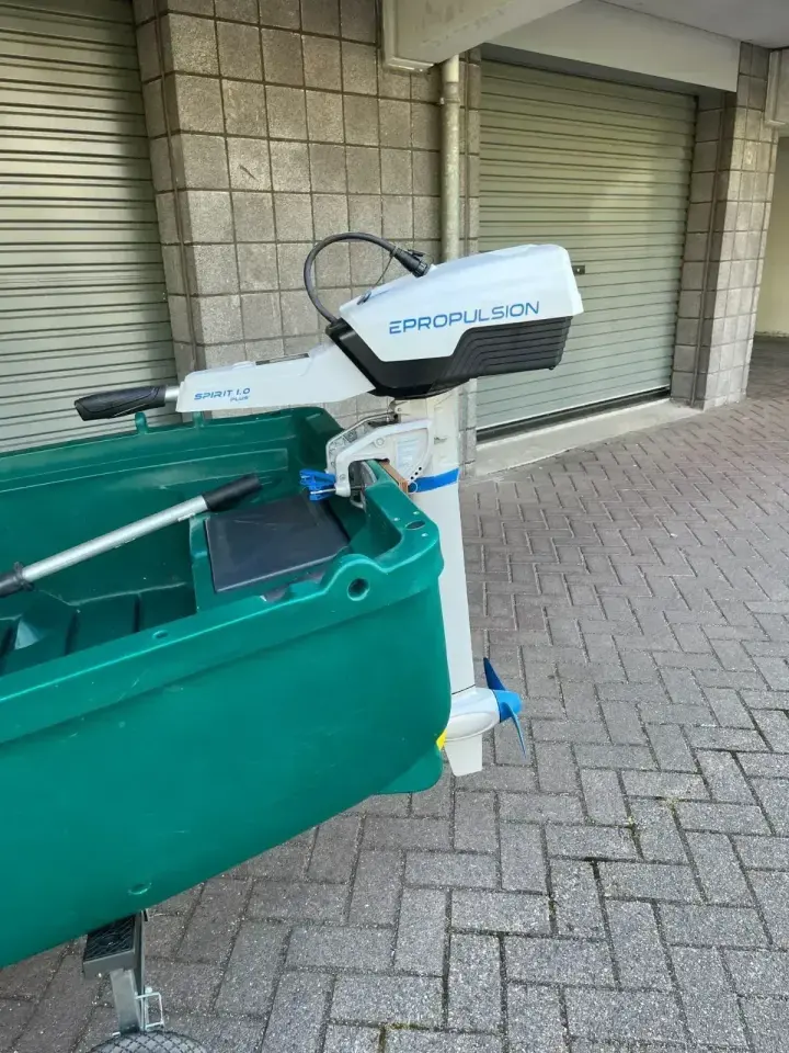 Prachtige set Fun Yak Toerboot dubbelwandig polyethyleen met fluistermotor EPROPULSION SPIRIT 1.0 PLus 1KW inclusief baterij, handkar om mee te vervoeren of te verplaatsen en een handlier. Wij hebben de boot ca 15 keer gebruikt maar door lichamelijk ongemak kunnen wij hem niet meer gebruiken. De boot is geschikt voor 4 personen / laadvermogen 300 kg. afmeting lenget 2,8 m, breedte 1,25 m. Gewicht 55 kg. Nieuwwaarde is E 3800,00