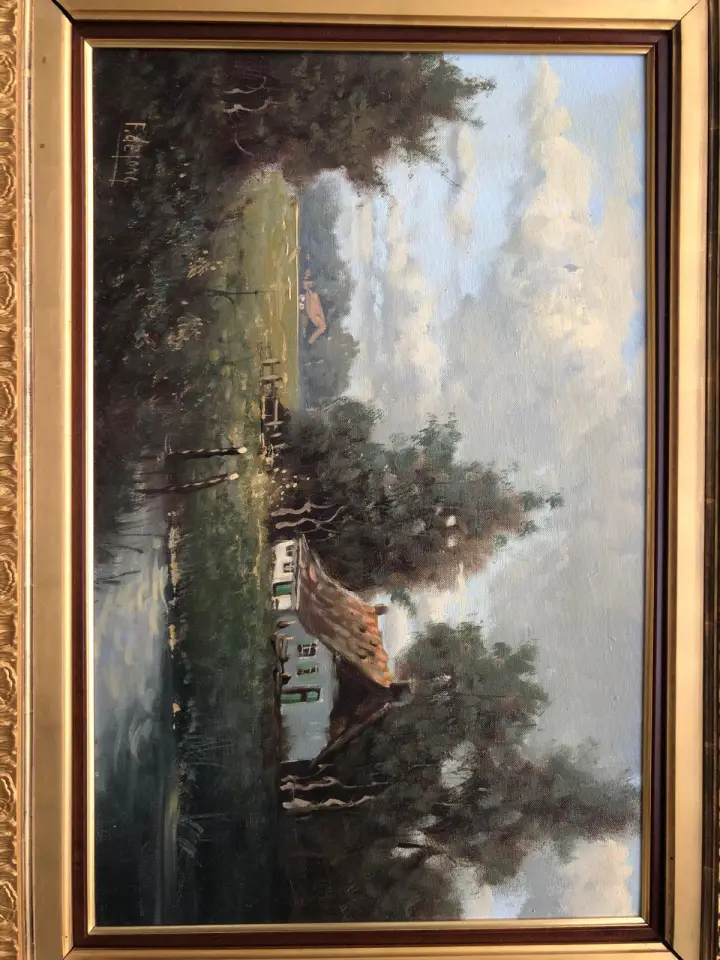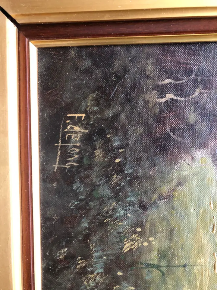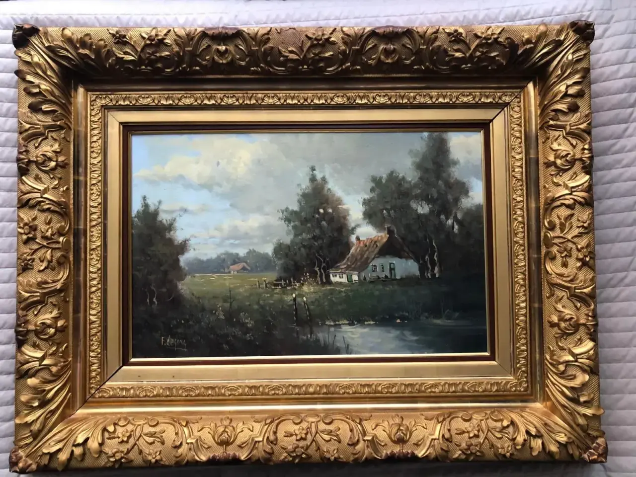 een zeer mooie lijst, het doek is prima conditie, de maten van de lijst zijn: 94 x 74 cm en het doek zelf zijn: 60 x 42 cm